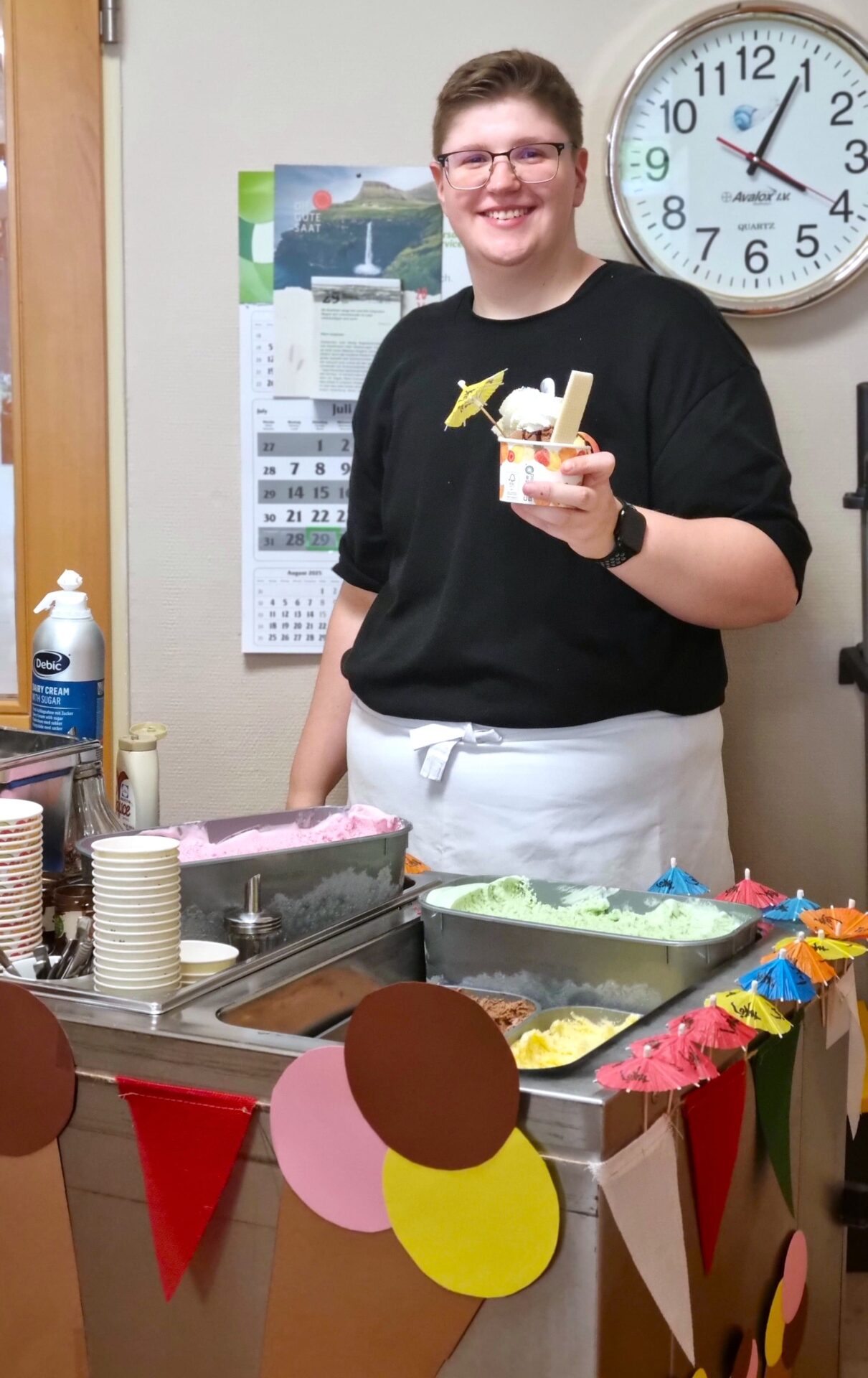 Sehr zur Freude der Bewohner fuhr am 29. Juli der Eiswagen durchs Haus. Es konnte zwischen verschiedenen Sorten Eis und Saucen gewählt werden. Alle Wünsche wurden berücksichtigt, egal ob mit oder ohne Sahne, bunten Streuseln, Waffeln und Schirmchen. Das zauberte vielen ein Lächeln ins Gesicht.