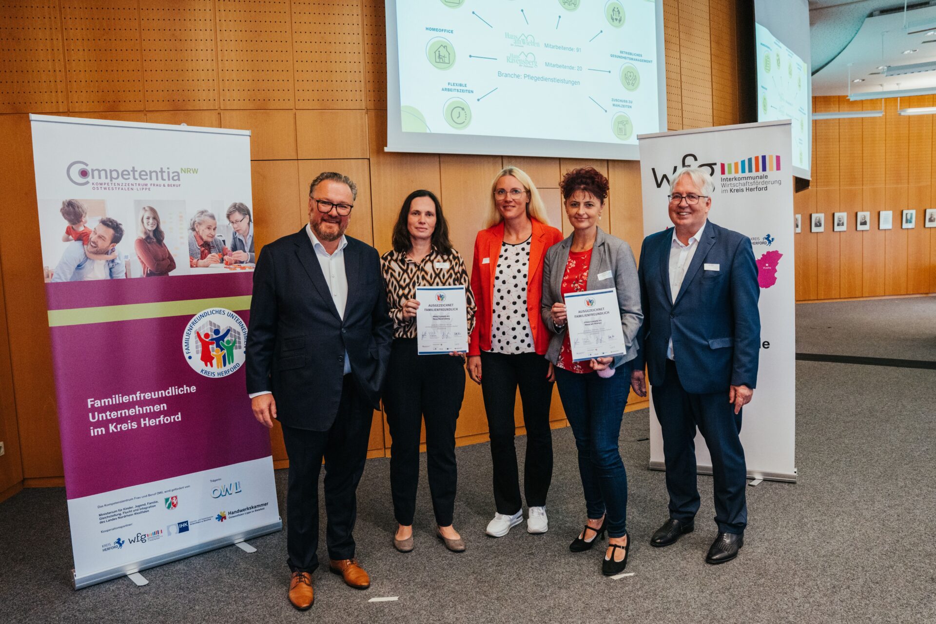 Die vier Häuser der Praetorius AG sind erneut als „Familienfreundliches Unternehmen im Kreis Herford 2025“ ausgezeichnet worden. Im Kreishaus Herford erhielt das Haus am Wiehen, das Haus Ravensberg, die Ravensberger Residenz und das Ravensberger Stift gemeinsam mit weiteren Betrieben die Urkunde für sein Engagement zur besseren Vereinbarkeit von Beruf, Familie und Pflege. Die Rezertifizierung bestätigt, dass die Praetorius AG seine familienfreundlichen Maßnahmen konsequent weiterführt und ausbaut und zeigt zudem, dass Familienfreundlichkeit fester Bestandteil der Unternehmenskultur ist.